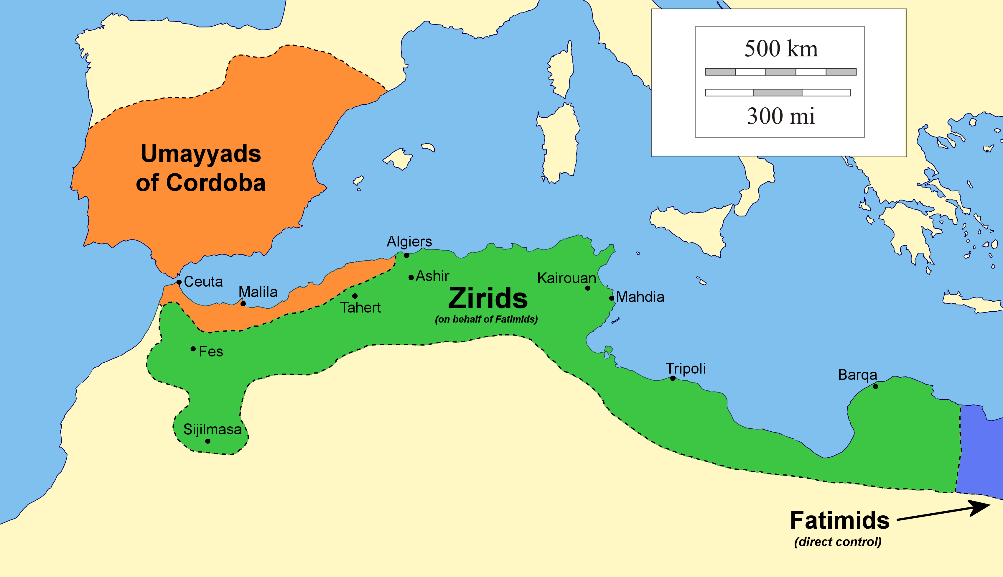 Additionally, another published map appears to show indirect Fatimid authority circa 1000 as applying to the exact same areas of Cyrenaica (and therefore presumably under Zirid control, given the context), see: Bramoullé, David (2018), "Itinerant Objects in the Fatimid World: From Cairo to al-Andalus to Sicily and Back" Melikian-Chirvani, Assadullah Souren, (ed.), "The World of the Fatimids", p. 247