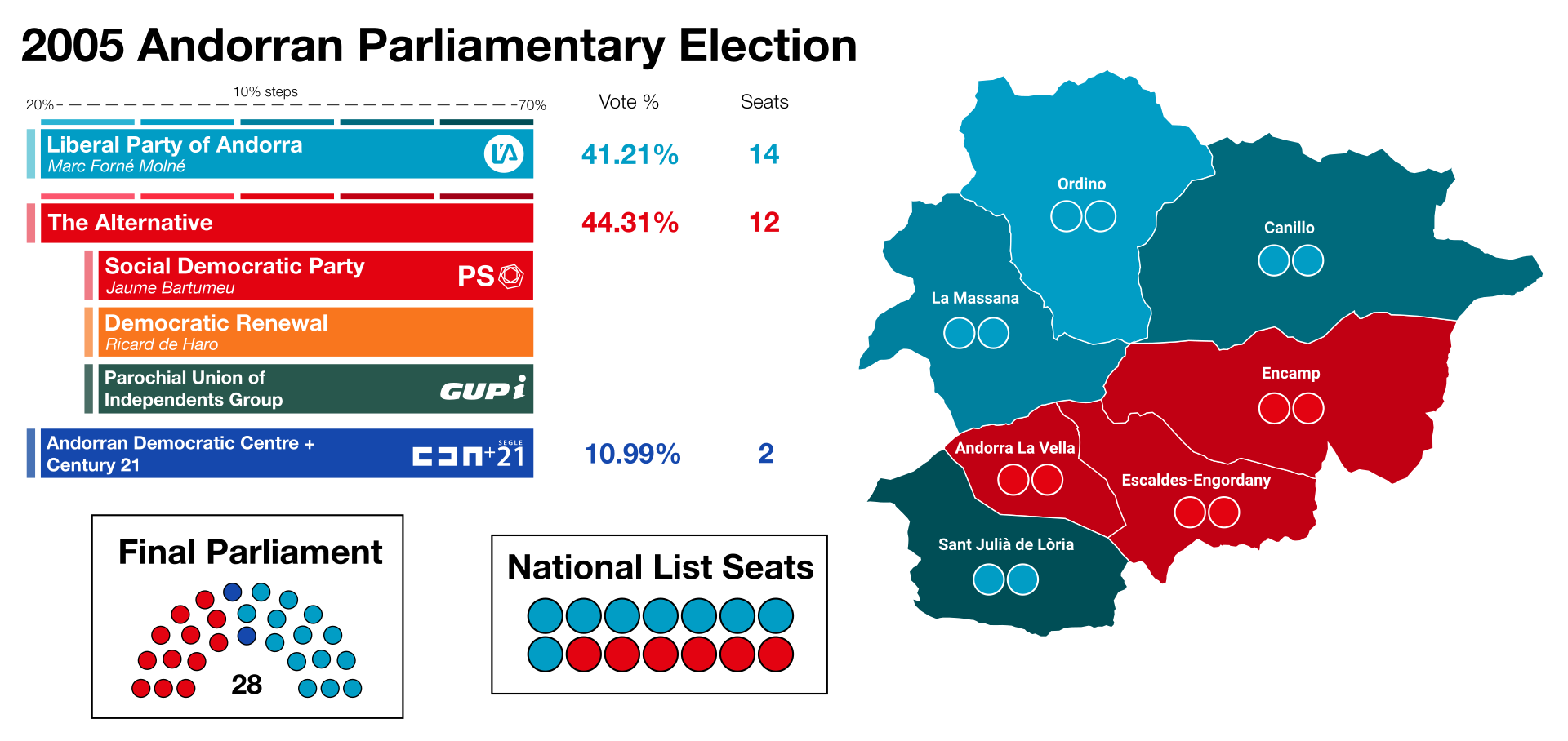 Map of the 2005 Andorran Parliamentary Election by parish. Data from Eleccions d'Andorra.
