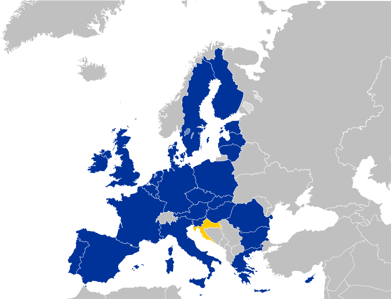 (Blue) EU members in 2013 (Yellow) New EU member admitted in 2013