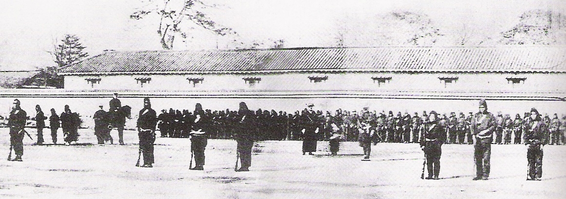 An 1868 photograph of Japanese Tokugawa Bakufu troops being trained by the French Military Mission to Japan