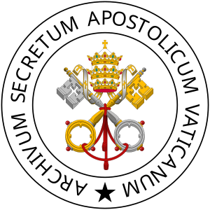 central field with the crossed keys and surmounted by the tiara, framed by two concentric circles, one by one, enclosing the epigraph "ARCHIVUM SECRETUM APOSTOLICUM VATICANUM" with the beginning and the end at the bottom, separated by a black five-pointed star. Interpretation of File:Coat of the Vatican Secret Archives