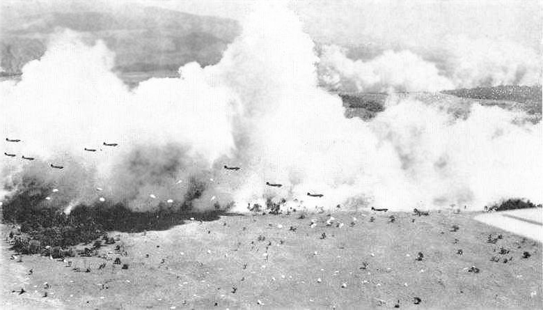 Dwarfed by and silhouetted against clouds of smoke (created to provide cover), C-47 transport planes from the US Army Air Forces drop a battalion of the U.S. 503rd Parachute Regiment at Nadzab. A battalion dropped minutes earlier is landing in the foreground. General Vasey was in the plane from which the photograph was taken