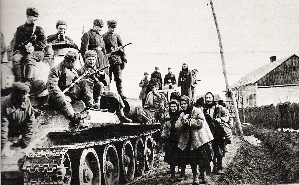 fotoreporter sovietico sconosciuto - scan da E.Bauer, Storia controversa della seconda guerra mondiale, vol. VI, De Agostini 1971 Soviet troops in a Ukrainian village (Eastern Front 1944)