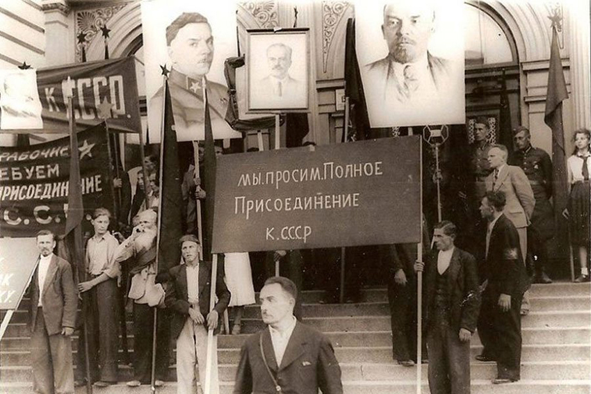 Soviet propaganda demonstration in Liepāja, 1940. Posters in Russian say: We demand the full accession to the USSR!
